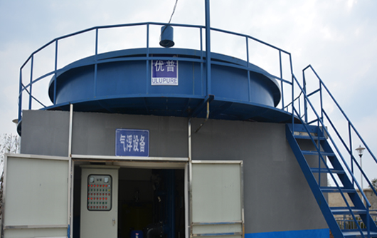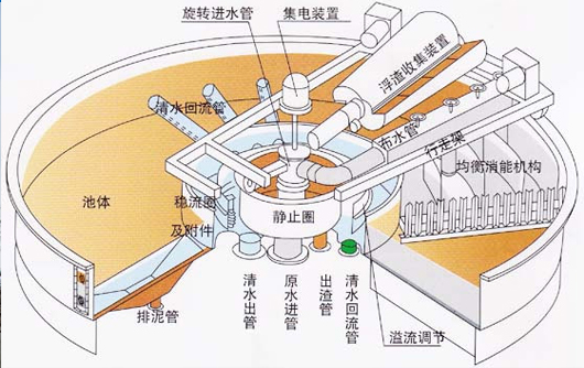 淺層氣浮機主要結構是指氣浮設備中的分離部分,包括:池主體、浮渣收集裝置、工作橋、行走裝置、溢流調節裝置、旋轉進水布水機構集電裝置等組成。將需要處理的原水通過提升泵進入中心進水管,同時溶氣水及藥液一起泵送至中心進水管與之進去融合,把所形成的壓力溶氣水通過減壓釋放,產生大量的微細氣泡,與污水中的懸浮絮體充分接觸融合,使水中懸浮污粘附在微氣泡上,然后隨氣泡一起上浮到到水層表面,形成浮渣,再刮去浮渣,撇渣機構與主機驅動機構同步移動,邊旋轉邊移動,從而將浮渣收集起來,通過中央泥管排出池外。池中的清水則通過清水收集管從中央排走,收集管也與主機驅動機構同步移動,清水管與布水管被布水機構隔開,彼此互不干擾。池底的沉積物被刮板刮入泥斗中,定期排放。
