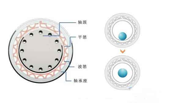 最初,葉輪轉子與軸承接觸,但當轉子進入高速旋轉狀態時,由于空氣的粘性和楔塊的作用,平面間會產生動壓效應。在箔片和轉子表面,使扁平箔和波紋箔發生彈性變形,將扁平箔推開,然后使轉子處于懸浮狀態。 不均勻的圓周氣壓使箔片軸承具有承受載荷的能力;蛘吒唵蔚卣f,在轉子高速旋轉期間,在轉子和箔片之間形成高壓氣膜,從而提升轉子。