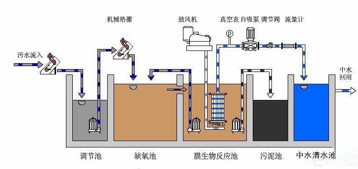 膜生物反應(yīng)器(MBR)是在廢水工程中應(yīng)用較成熟的處理技術(shù)。簡單地說是利用纖維膜或平板膜組件直接將曝氣池進(jìn)行泥水分離,利用膜的選擇透過性實(shí)現(xiàn)曝氣池中的生物富集,使得生物處理效率大幅度提高,生物處理后的污水再經(jīng)膜分離后得到潔凈的回用水。它是保護(hù)水環(huán)境,實(shí)現(xiàn)污水資源化的一項重要技術(shù),MBR技術(shù)是目前公認(rèn)的最有發(fā)展前途的環(huán)境治理技術(shù)之一,也是處理高濃度廢水和污水中水回用的理想技術(shù)。 1 MBR工藝應(yīng)用實(shí)例 湖北某食品原料廠的廢水屬于中高濃度有機(jī)廢水,水量為145 m3 /d,進(jìn)水CODcr為7300 mg/L,現(xiàn)在需將其處理使之滿足中水回用標(biāo)準(zhǔn),再將中水回用于廠區(qū)內(nèi)的綠地澆水使用。 1.1 工藝設(shè)計參數(shù) 工藝設(shè)計水質(zhì)水量如表1所示。 1.2 工藝流程圖
