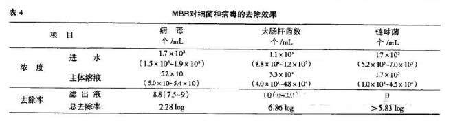 從大部分膜(約0.4微米)的孔徑來看,膜孔徑要遠遠大于病毒的平均粒徑(200 nm),因此,在主體料液中沒有懸浮固體條件下,膜本身對病毒沒有截留效果是可以理解的,但在活性污泥的過濾中對病毒卻體現出相當程度的去除,因此可以得出結論,在MBR對污水過濾過程中,在膜面形成了生物膜沉積層,使孔徑變小,從而實現對病毒的去除。這種去除機理包括:由于膜實際有效孔徑的減小的物理作用、由于沉積層對病毒吸附的化學作用以及沉積層中其他微生物對病毒吞噬的生物作用。 根據對MBR除菌的總結經驗數據,總結出MBR對病菌和病毒的去除效果見表4。從表4可知,MBR對病毒的總去除率可達到2.3 log(1og:以l0為底的對數,用以表示對細菌去除的數量級),對細菌和病毒的去除率表現了極好的去除能力,其出水無需消毒即可達到相關的衛生標 準,可見其在醫療廢水中的應用有著廣闊的前景.