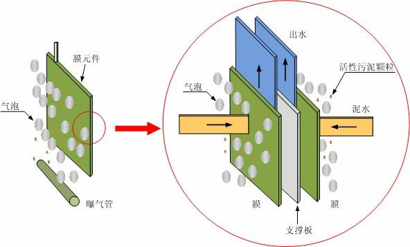 浸沒式膜生物反應器(MBR)的最早研究可以追溯到上世紀60年代末期的美國。1969年Smith等報道采用超濾膜來替代傳統活性污泥工藝中的二沉池,用于處理城市污水。70年代末期,日本由于污水再生利用的需要,膜生物反應器(MBR)的研究工作有了較快的進展。自1983年到1987年日本有13家公司使用好氧膜生物反應器(MBR)處理大樓污水,處理水作為中水回用。從80年代后期到90年代初,Zenon公司繼續Dorr-Oliver公司的早期研究,以開發用于處理工業廢水的系統并獲得了成功。Zenon公司的商業化產品,enoGem于1982年投入使用。 我國對浸沒式膜生物反應器(MBR)的研究始于上世紀90年代初。最早開始研究的有清華大學、中科院生態環境中心、天津大學、同濟大學等。近年,由于該項技術所具有的巨大吸引力和潛在的應用前景,受到了更多研究者的青睞。 浸沒式膜生物反應器(MBR)作為目前污水生化處理的核心技術,起到保障出水水質的末端工藝,其核心膜組件型式多種,但從技術原理來講,萬變不離其中,今天小編就帶你系統了解下其原理是怎么回事,讓你對各種膜組件、配置有一個系統認識。 1、浸沒式膜生物反應器原理 浸沒式膜生物反應器(MBR)是膜分離技術和生物技術的有機結合。用超濾或微濾膜分離技術取代傳統的活性污泥法的二沉池和常規過濾單元,使水力停留時間(HRT)和泥齡(STR)完全分離。其高效的固液分離能力使出水水質良好,懸浮物和濁度接近于零,并可截留大腸桿菌等生物性污染物,處理后出水可直接回用,出水水質要明顯優于傳統污水處理工藝,是一種高效、經濟的污水資源化技術。 膜分離原理