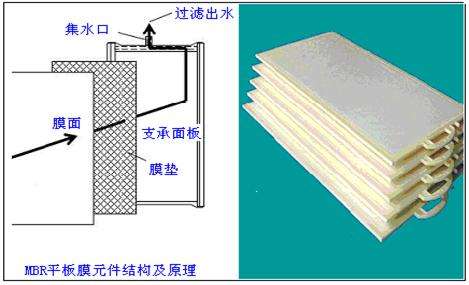 篩分過程,浸沒式膜生物反應器(MBR)操作壓力一般在0-70kPa,混合液在靜壓差或自吸泵的作用下,透過纖維素或高分子材料制成的微孔濾膜,利用其均一孔徑,來截留水中的微粒、細菌等,使其不能通過濾膜而被去除。 2.2.2平板膜原理和形式