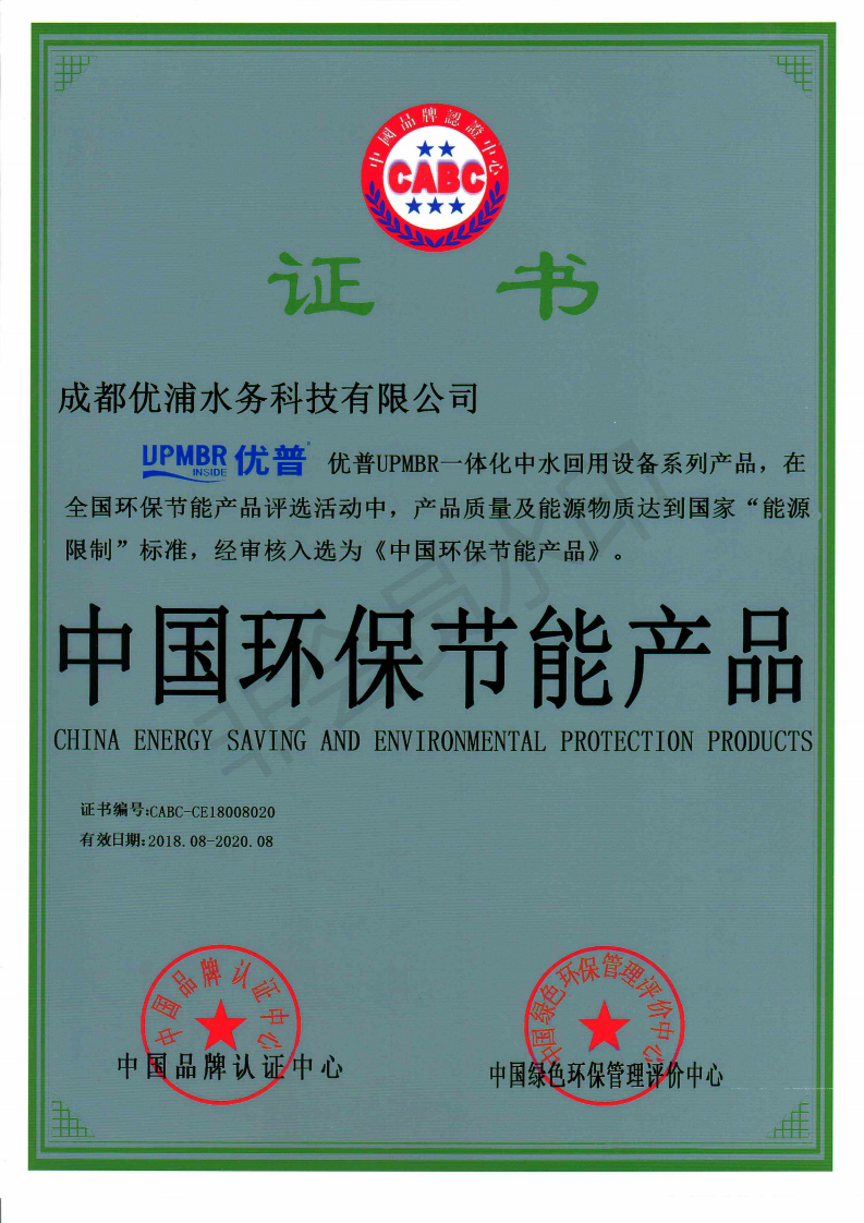 2018年8月,成都優浦水務科技有限公司成功獲得中國綠色環保管理評價中心與中國品牌認證中心聯合頒發的“中國環保節能產品證書”。 優普UPMBR一體化中水回用設備系列產品,在全國環保節能產品評選活動中,經專家評定,符合綠色、節能的要求、產品質量及能源物質達到國家“能源限制”標準,現已獲得綠色建筑節能推薦產品證書。 中國環保節能產品證書的獲得,意味著優普的技術研發能力已經邁向更高臺階。優普服務于國家戰略,以節約資源、保護環境、建設綠水青山為基本原則,為國內的污水處理提供綜合解決方案,為客戶創造更多的價值。