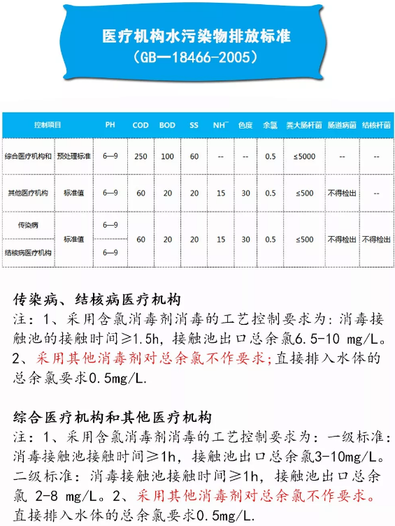 3、大幅減少占地面積。較之傳統活性污泥法工藝MBR膜池污泥濃度可達8.0—12g/L,提高了生化處理效率,縮短了污水的停留時間,同等污水處理量下MBR工藝較之傳統工藝可節省20%—30%左右的占地面積。 4、大幅減少剩余污泥的排放量,污泥因為MBR膜片的過濾作用被截留在MBR反應器內,污泥在停留期間有充足的時間進行穩定的反應,組成污泥的有機質可充分降解為二氧化碳和水,因此剩余污泥產量遠遠低于活性污泥法。 5、傳統消毒工藝主要采用氯系消毒劑,不論液氯還是二氧化氯,都屬于危險化學品且腐蝕性大,購置和儲存都需要辦理相應的資質,操作復雜而繁瑣,并且因為采用含氯消毒劑,環保監測指標將增加CL¯監測欄,而污水中CL¯的控制難度極大,依賴于專業技術人員的經驗。而MBR工藝出水濁度幾乎為零,不影響光線的透光度,因此MBR出水可以用紫外線消毒工藝,確保污水細菌學指標滿足排放要求,同時節省了購買消毒藥劑的成本,亦避免了總余氯CL¯指標檢測不達標的風險。 三、醫療機構水污染物排放標準