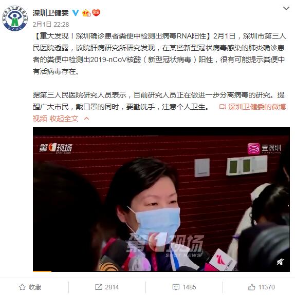 2月1日,深圳衛健委官博發布了一則消息:在新型冠狀病毒肺炎患者的糞便中,檢測出病毒RNA陽性。