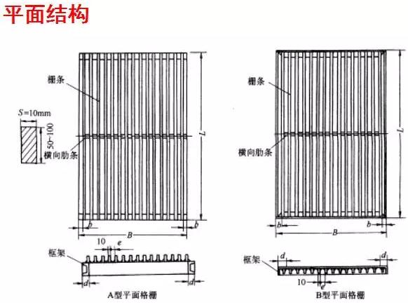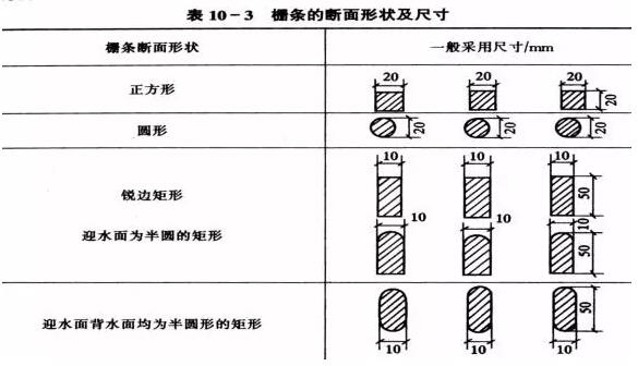格柵柵條的斷面形狀有圓形、矩形及方形,圓形的水力條件較方形好,但剛度較差。自前多采用斷面形式為矩形的柵條。