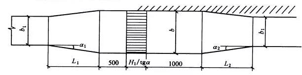 架設格柵的渠道,柵前和柵后應分別保持0.5m和1.0m以上的直線距離.為了防止柵前渠道內水面出現阻流回水現象,架設格柵的渠段寬度由原來的b1放寬到b,渠前有擴大段L],展開角20度,渠后有收縮段L,,一般取L,=L/2。 |