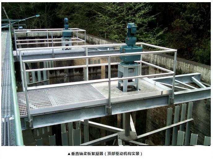 (2)垂直軸槳板式絮凝器 垂直軸槳板式絮凝器由一個驅動組件組成,該組件包含齒輪電動機、不銹鋼驅動架、聯軸器、軸環、止推軸承和驅動軸等,該驅動軸連接到下面的全不銹鋼槳板組件,徑向推力軸承需要能夠承受軸向、垂直和徑向推力載荷,以延長使用壽命。安裝在池底上的軸承穩定性并經久耐用。垂直軸槳板式絮凝器驅動裝置安裝在絮凝池上方的橋梁或走道上。每個垂直軸槳板絮凝器都有單獨的驅動組件。