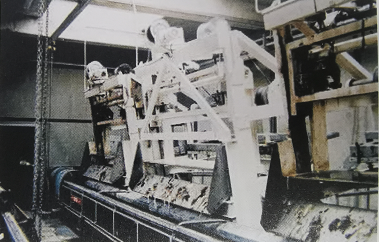 圖4 Algiers泵站(美國新奧爾良):四臺(tái)5.5m寬、6.1m深的Climber格柵 當(dāng)需要處理流量很大(大于30000m/h)并且雜質(zhì)較少(如地表水取水)的來水時(shí),可以采用移動(dòng)式柵耙進(jìn)行清理,它每次只清理一部分格柵面,并在清理完成后橫向移動(dòng)。 c.回轉(zhuǎn)式格棚 這種間隙為3~15mm的格柵系統(tǒng)采用了連續(xù)鏈條柵架,這些具有特殊鉤形的耙齒,通過串接軸連接形成環(huán)形格柵簾,柵渣被提送到頂部,然后在背面自行掉落。 耙齒由連接臂(鏈節(jié))和鉤形端頭組成。鉤形端頭錯(cuò)位推移離開耙齒,從而清理出柵渣,隨后由一個(gè)轉(zhuǎn)刷完成自動(dòng)清理過程。 d.階梯格柵 柵條間隙為3~15mm,格柵篩架由兩組平行的柵片組成,一組為靜片,一組為動(dòng)片,兩組柵片交替排列裝配成階梯形。 由一組鉸鏈臂驅(qū)動(dòng)移動(dòng)?xùn)牌M(jìn)行轉(zhuǎn)動(dòng),逐級(jí)將柵渣向上提升,直至到達(dá)頂部排渣位置。 ②后清式(背耙式)格柵 某些格柵的清渣系統(tǒng)采用設(shè)在柵架背面的循環(huán)鏈條。雖然存在柵渣掉入下游水體中的風(fēng)險(xiǎn),但是這種格柵可以用作對(duì)清渣能力要求很高的初級(jí)格柵(圖5),能夠處理柵渣量很大的原水.