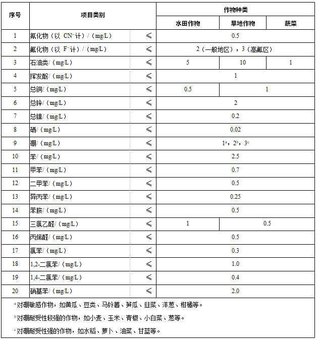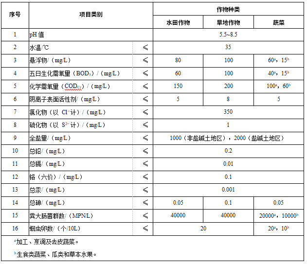 3術語和定義 下列術語和定義適用于本標準。 3.1 農田灌溉用水 farmland irrigation water 為滿足農作物生長需要,經人為輸送,直接或通過渠道、管道供給農田的水。 3.2 水田作物 paddy field crops 適于水田淹水環境生長的農作物,如水稻等。 3.3 旱地作物 dry land crops 適于旱地、水澆地等非淹水環境生長的農作物,如小麥、玉米、棉花等。 4農田灌溉水質要求 4.1農田灌溉水質控制項目分為基本控制項目和選擇控制項目。 4.1.1基本控制項目為必測項目,應符合表 1 的規定。 4.1.2選擇控制項目由地方生態環境主管部門會同農業農村、水利等主管部門根據農田灌溉用水類型和作物種類要求選擇執行,應符合表 2 的規定。 表 1 農田灌溉水質基本控制項目限值