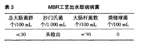 2.3 主要構筑物及設備 2.3.1 格柵井 醫療污水與化糞池出水匯集到進水砂井后,自流人格柵井,井內設兩道手動格柵,第一道格柵的間隙為10 mm,第二道格柵的間隙為5 mm,截留水中懸浮物,減少后續處理負擔及避免影響泵的正常運行。 2.3.2 調節沉淀池 調節沉淀池的作用有均衡水量水質以及去除各種懸浮物等作用,減少后續處理的負擔,保證系統連續穩定地運行。 停留時間:HRT=14 h 外形尺寸:7 800mmX 3 600mm x 4 150mm 2.3.3 膜生物反應器 膜生物反應器由生物反應器與膜組件兩部分構成,主要有池體、膜組件、鼓風曝氣系統、泵及管道閥門儀表等。 停留時間:HRT=5 h 設計凈空尺寸:6000mmX2000mm×3 500mm 膜組件是本套系統的核心部件,出水水質的好壞及處理成本與其有直接的關系,由專業生產廠商提供,根據不同的水質要求,一般選擇的膜組件也不相同,本工程選擇有機膜,膜的孔徑在0.3微米,膜通 量為l2 L/(m 2.h)。鼓風曝氣系統采用羅茨風機+微孔膜曝氣器系統,管道上設有調節閥來調整膜組件的曝氣強度,以減輕膜污染。 2.3.4 設備及材料 (1)污水提升泵(調節沉淀池) 型號:WQ]0—8—0.75 規格:Q=10 m3/h,H=8 m,N=0.75 kW 數量:2臺(1用1備) (2)污水泵 型號:WQ10—10—1 規格:Q=10m3/h,H=10m,N=I kW 數量:2臺(1用1備) (3)污泥泵 型號:G30VW一102 數量:2臺(1用1備),N=I kW (4)羅茨風機 型號:J 一50 規格:Qs=1.9 m3 /min,P=44.1 kPa,N=3 kW 數量:2臺(I用I備) (5)曝氣軟管 管材質由聚氯乙烯和橡膠合成,內襯化學纖維線長度:38 m 2.4 MBR工藝處理醫療廢水的優勢 2.4.1 MBR對醫療廢水中病源性微生物去除的試驗分析 Berthold Gunder等利用膜分離(管式膜、板式膜、中空纖維膜組件)取代二沉池處理生活污水中試研究,對出水微生物進行了檢測,結果如表3。