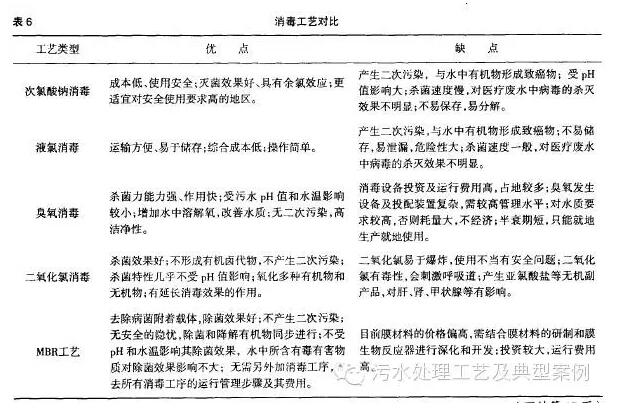 (3)對污水處理系統的自動化程度要求較高,必須易于管理和操作。 (4)醫院大都位于人口密集、地價較高的地段,處理系統的占地不能太大,且處理后的污泥量不宜太大。 MBR主要具有如下幾個特點: (1)濾膜出水水質優異,由于濾膜同時起生物載體和截污的作用,故水處理效率高,懸浮物非常低,作為檢驗細菌和病毒數量的大腸桿菌數也很低。它是唯一的對污水進行生物處理后出水無須消毒的工藝,出水可達一級標準,直接回用于非飲用水。 (2)MBR維持了較低的F/M 比(污泥負荷),減少了剩余污泥的產量,甚至不排剩余污泥。 (3)MBR實現了水力停留時間(HRT)和污泥停留時間(SRT)的徹底分離,消除了傳統活性污泥工藝中的污泥膨脹問題。 (4)減少了二沉池,結構緊湊,整套裝置占地省,僅為傳統方法的四分之一,非常適用于人多地少的大城市,且基建投資少。 (5)過程密閉,杜絕二次污染。 (6)自動化程度高,更有利于對高危險性廢水治理的管理和控制。 由以上特點可知,MBR工藝對醫療廢水的處理是十分適用的,其針對性非常強,因此它在醫療廢水處理中的優勢也是顯而易見。由于對醫療廢水的病毒處理有特殊要求,污水處理中對其消毒效果有比較嚴格的要求。對于消毒工藝的應用,常用的工藝對比見表6。