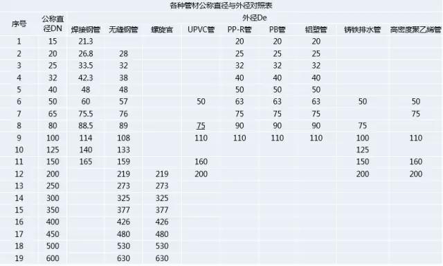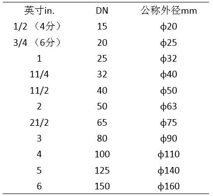 公稱直徑可用公制mm表示,也可用英制in表示。管路附件也用公稱直徑表示,意義同有縫管。它與英制單位的對應關系如下: