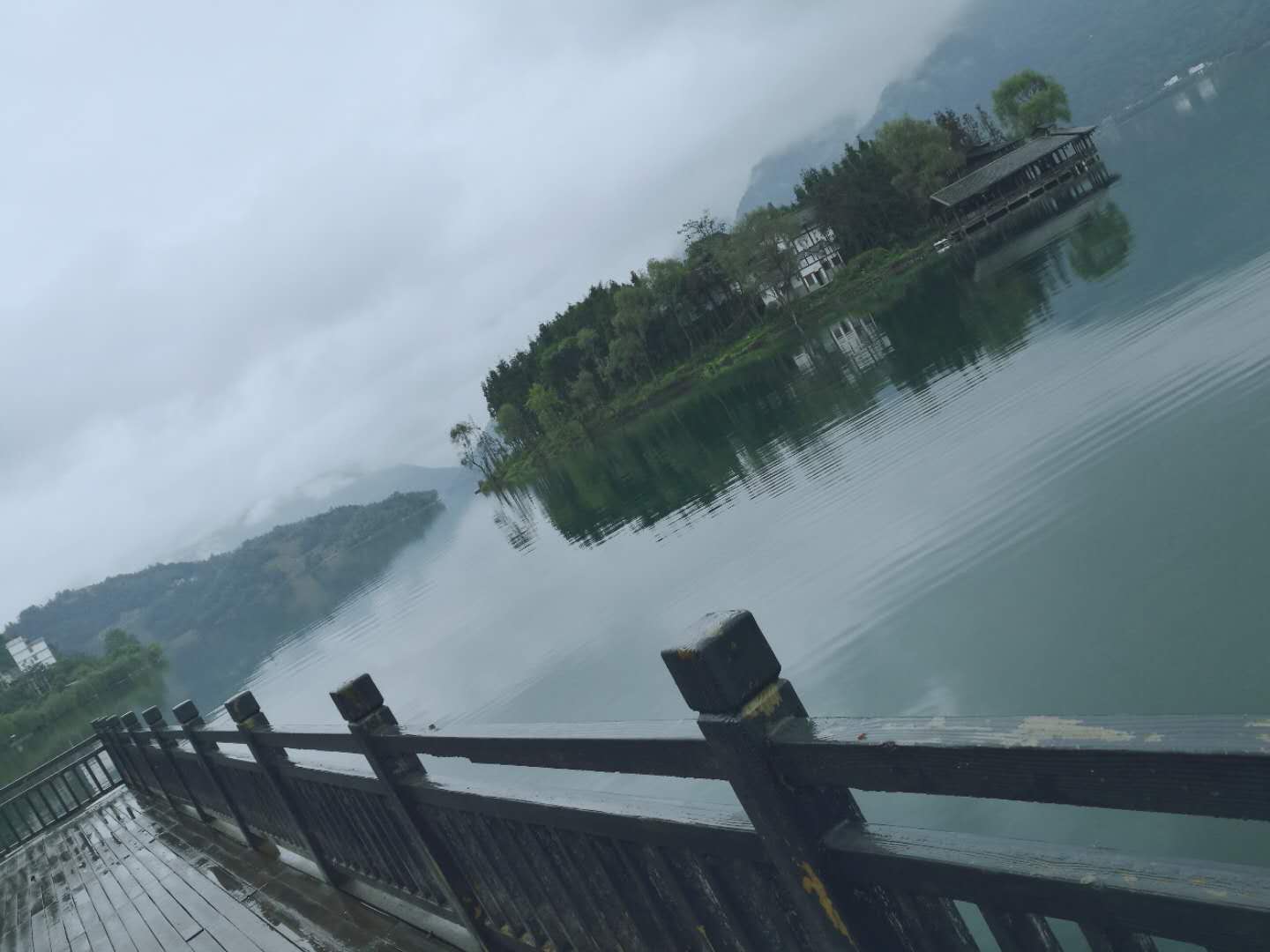 第二天一早,雨勢未停,還有愈演愈大的氣勢。大家商量后,決定開車繞行馬湖,倒是別有情趣。水中植物被雨水拍打,岸邊的長柳則在稀疏的搖擺,湖中冒雨打魚的四方小船,還有停靠繩牽的小船,天地間倒映著對面小島以及上面的房屋與莊家,清轍透明湖底搖波著游弋的小魚,有一絲絲的慰藉和悵然。