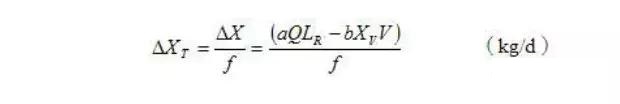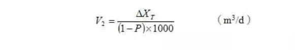 式中: SL——每人每日污泥量[按每人每日計產生的初沉污泥量為 14-27g,初沉污泥含水率以 95%-97%計,則每人每日產生初沉污泥量一般采用0.3-0.8L/(人·d)],L/(人·d); N——設計人口數(可采用城市人口數或污水處理廠設計當量人口數),人; t——初沉池兩次排泥的間隔時間,d。 應注意V1 是計算公式中所取定含水率P1 時的污泥量。 2、剩余污泥體積流量V2 (1)剩余污泥干質量Δ XT 每日排除剩余污泥干重Δ XT(kg/d)等于活性污泥系統中每日產生的活性污泥干質量。